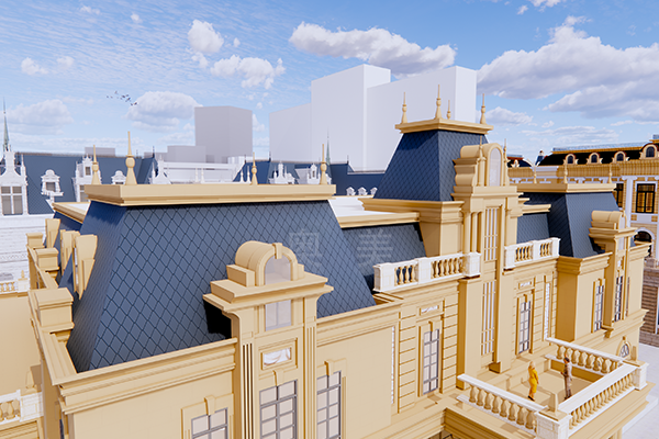 此為中東歐商務中心項目,此屋面系統采用的是新型建筑材料金屬復合瓦鋪設...
